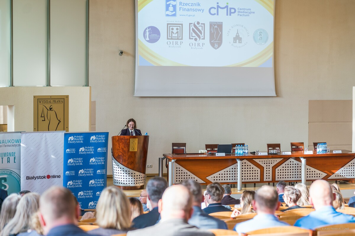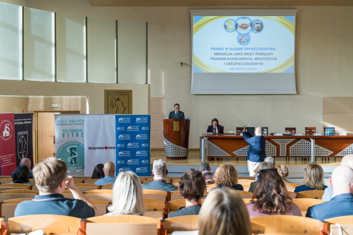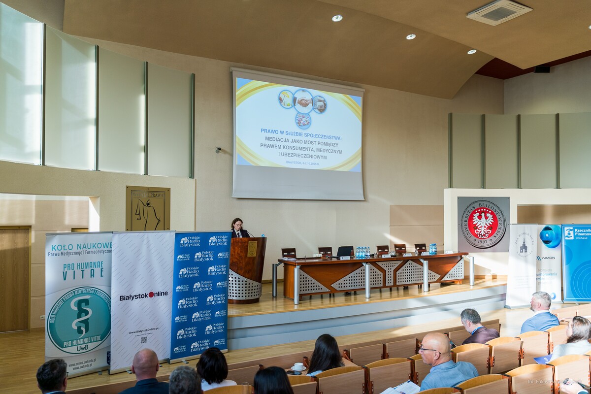 Na Wydziale Prawa Uniwersytetu w Białymstoku rozpoczęła się dzisiaj (6 października 2025 r.) dwudniowa międzynarodowa konferencja naukowa pod hasłem „Prawo w służbie społeczeństwa: Mediacja jako most pomiędzy prawem konsumenta, medycznym i ubezpieczeniowym”. Uroczystego otwarcia wydarzenia dokonał Rektor Uniwersytetu w Białymstoku – prof. dr hab. Mariusz Popławski, który wspomniał o innych ważnych wydarzeniach organizowanych przez uczelnię, a także wymienił najistotniejsze osiągnięcia Wydziału Prawa w przestrzeni naukowej i dydaktycznej. Patron honorowy konferencji – Marszałek Województwa Podlaskiego – Łukasz Prokorym zwrócił uwagę na to, jak ważną rolę odgrywa mediacja w rozwiązywaniu sporów, których stroną jest w wielu przypadkach samorząd województwa. Prodziekan Wydziału Prawa ds. rozwoju – dr Kamila Bezubik także odniosła się w swojej wypowiedzi do znaczenia alternatywnych metod rozwiązywania sporów i ich znaczenia w funkcjonowaniu każdego z nas we współczesnej rzeczywistości.