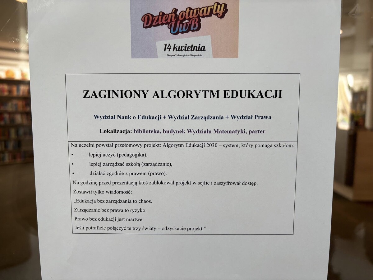 Na tle całego wydarzenia wyróżniały się także uniwersyteckie escape roomy, w tym ten zatytułowany „Zaginiony Algorytm Edukacji”, stworzony m.in. przez zespół Wydziału Prawa. Uczestnicy, pracując w kilkuosobowych grupach, rozwiązywali zadania wymagające logicznego myślenia i podstawowej wiedzy z różnych dziedzin, w tym prawa. Zabawa miała wyraźny walor edukacyjny i pokazywała, jak w praktyce przenikają się różne kompetencje.