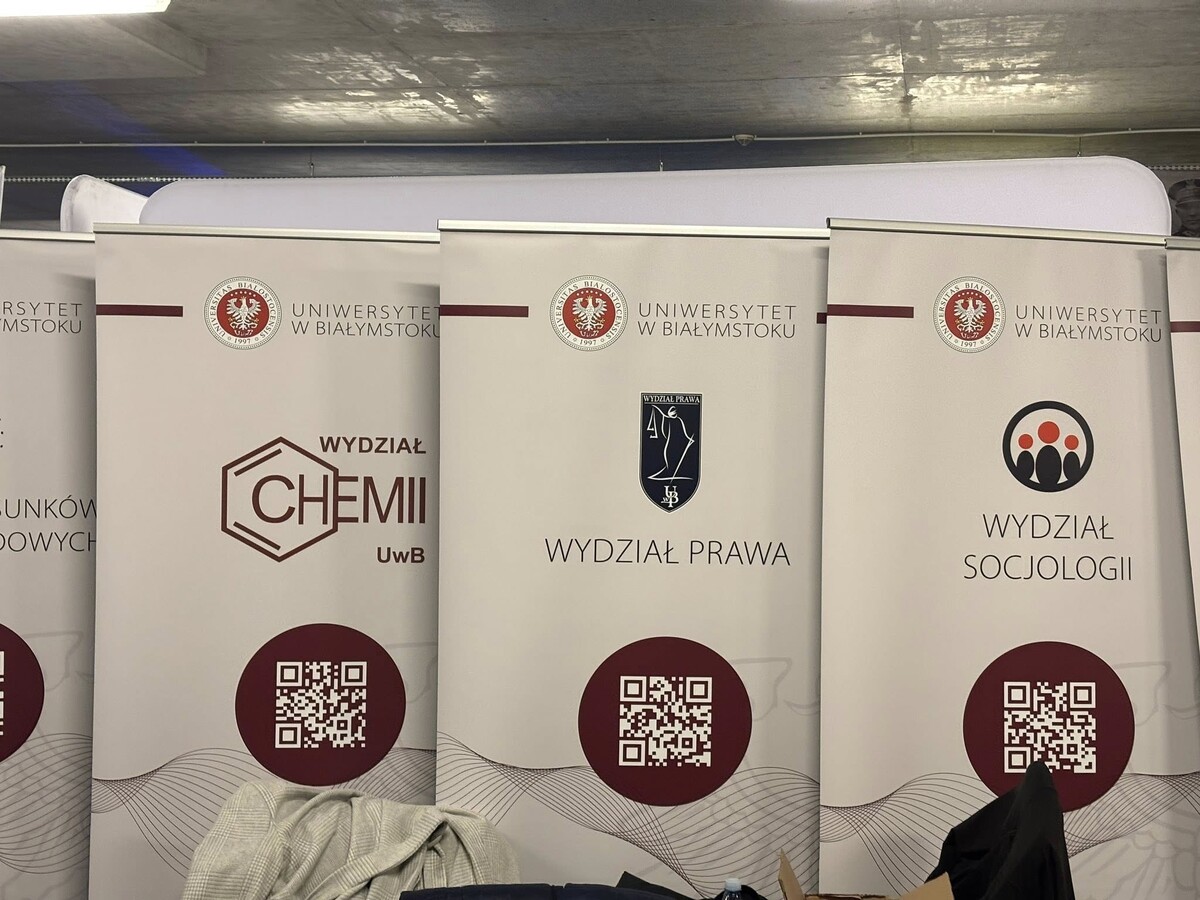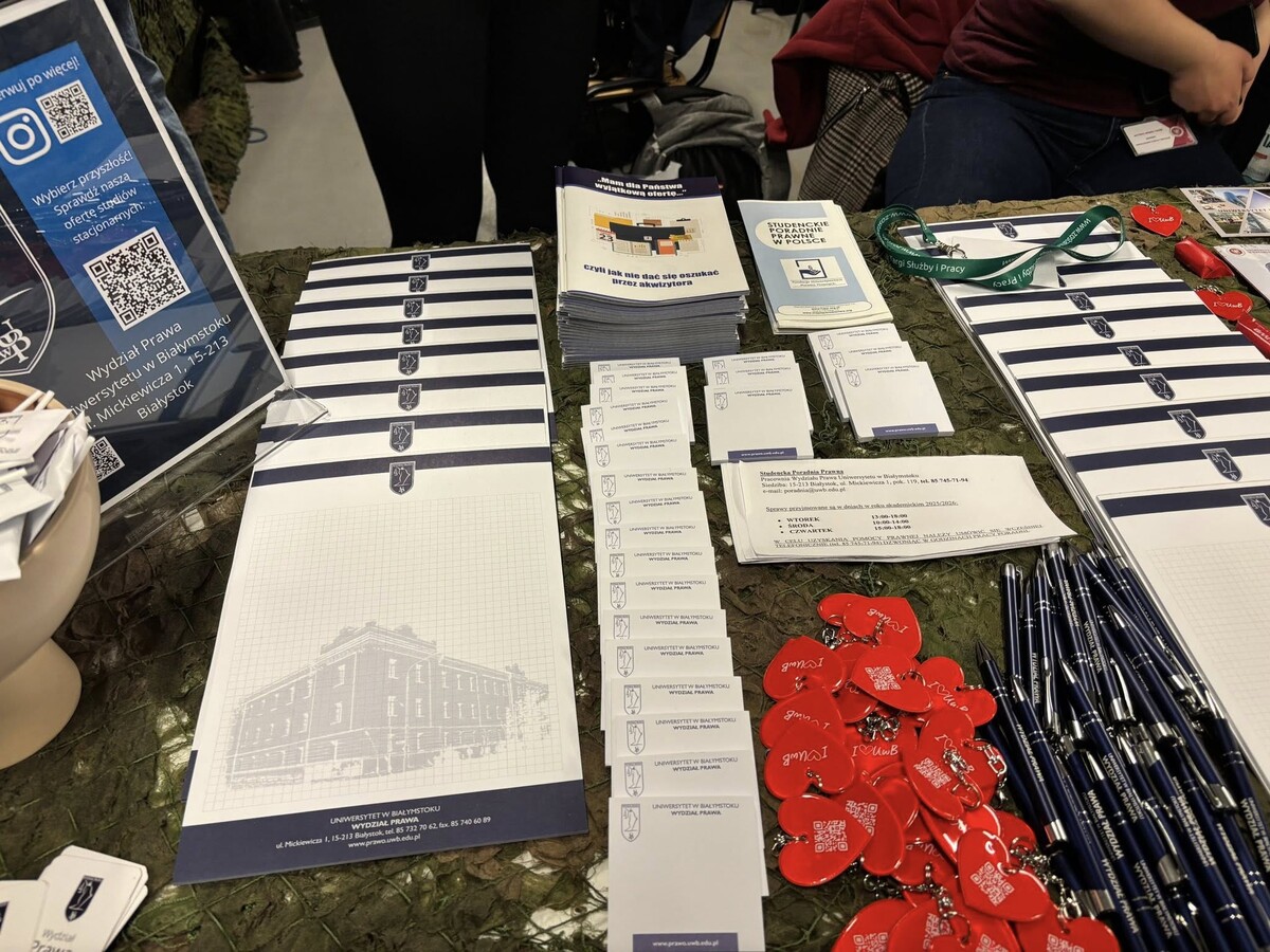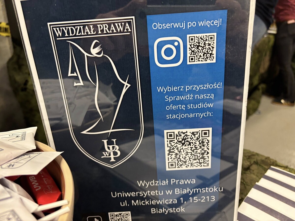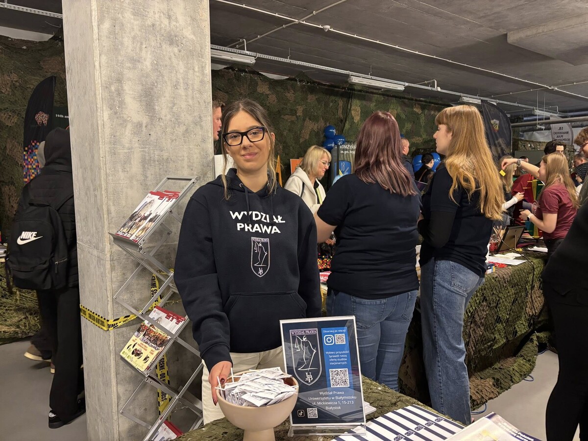 Jednym z najbardziej obleganych punktów targów było stoisko przygotowane przez Wydział Prawa Uniwersytetu w Białymstoku. Już od pierwszych godzin wydarzenia przyciągało ono młodzież zainteresowaną studiami prawniczymi oraz ich praktycznym wymiarem. Przestrzeń ta stała się miejscem licznych rozmów o edukacji, przyszłości zawodowej i realiach współczesnego rynku usług prawnych.