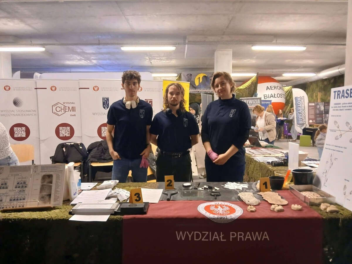 Istotnym elementem obecności wydziału były również interaktywne atrakcje przygotowane przez studentów. Koło Naukowe Prawa Karnego i Kryminologii UwB, którego opiekunem jest dr Justyna Omeljaniuk, zaprosiło uczestników do strefy daktyloskopijnej, gdzie można było samodzielnie wykonać odciski palców i zobaczyć ich analizę w praktyce. Ta forma prezentacji cieszyła się ogromnym zainteresowaniem i w przypadku licznego grona odwiedzających Targi stała się jednym z najbardziej zapadających w pamięci doświadczeń z całych targów.