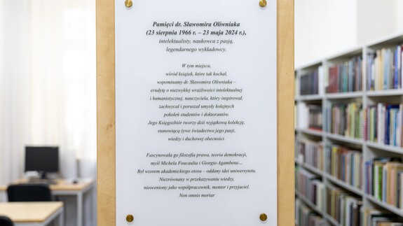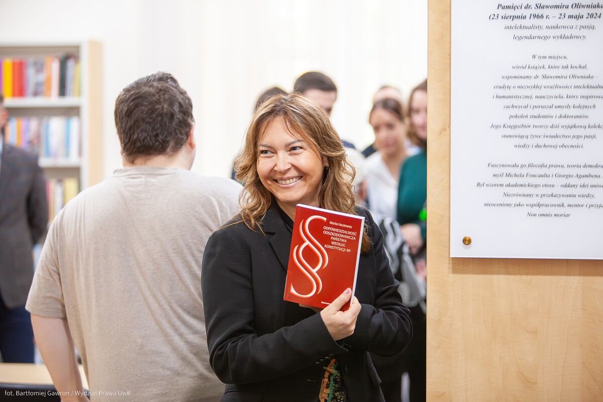 Kolejnym punktem wydarzenia było odsłonięcie tablicy pamiątkowej poświęconej śp. dr. Sławomirowi Oliwniakowi połączone z prezentacją Jego księgozbioru, który jest dostępny w Bibliotece Prawniczej UwB.