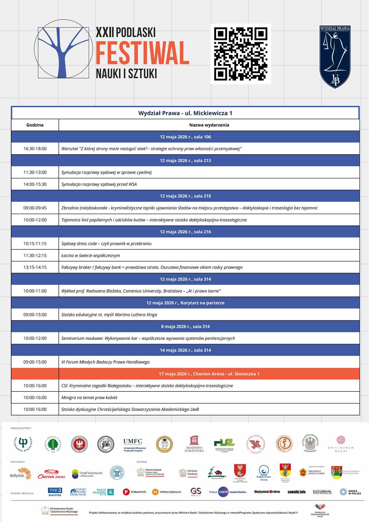 Wydział Prawa Uniwersytetu w Białymstoku zaprasza wszystkich zainteresowanych prawem, nowymi technologiami oraz praktycznym wymiarem funkcjonowania wymiaru sprawiedliwości na wyjątkowy dzień wydarzeń edukacyjnych i popularyzujących wiedzę, który odbędzie się 12 maja 2026 r. w siedzibie jednostki przy ulicy Mickiewicza 1 w Białymstoku w ramach tegorocznego XXII Podlaskiego Festiwalu Nauki i Sztuki. Program przygotowanych atrakcji jest niezwykle bogaty i różnorodny, dzięki czemu każdy uczestnik, niezależnie od wieku, zainteresowań czy stopnia znajomości zagadnień prawnych będzie mógł znaleźć atrakcje, które przypadną mu do gustu. Wydarzenia zaplanowano od godzin porannych aż do późnego popołudnia, a ich wspólnym mianownikiem jest pokazanie prawa w działaniu oraz przybliżenie jego praktycznego znaczenia w codziennym życiu.