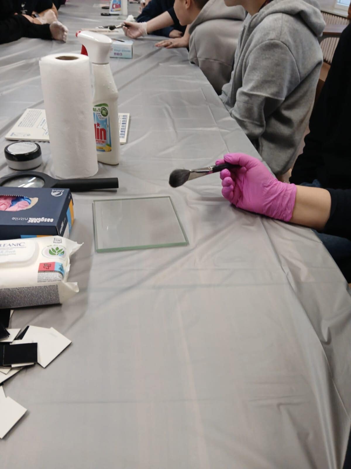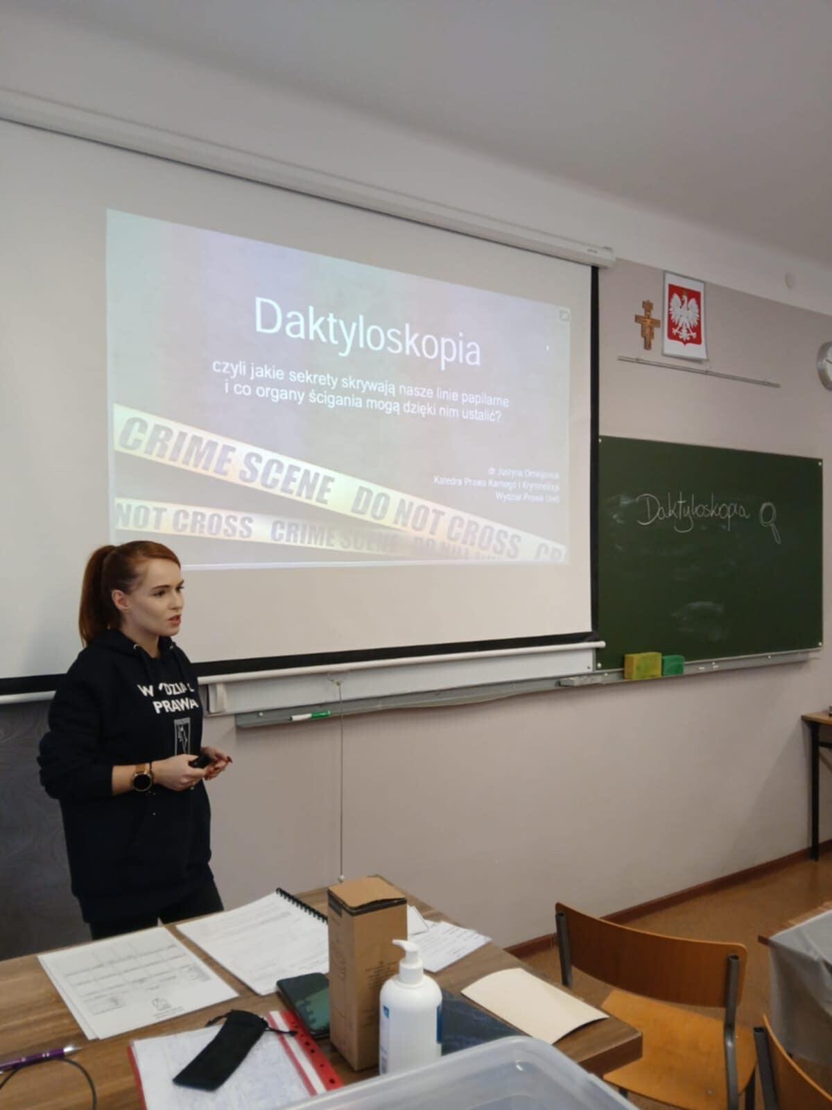 Najpierw odbyła się część wykładowa dotycząca teoretycznych tajników zbierania odbitek linii papilarnych. Następnie uczniowie mogli uczestniczyć w interaktywnym stoisku daktyloskopijnym i pod czujnym okiem studentów z Koła spróbować swoich sił w ujawnianiu odbitek linii papilarnych na szkle przy pomocy argentoratu oraz na desce daktyloskopijnej przy pomocy tuszu.