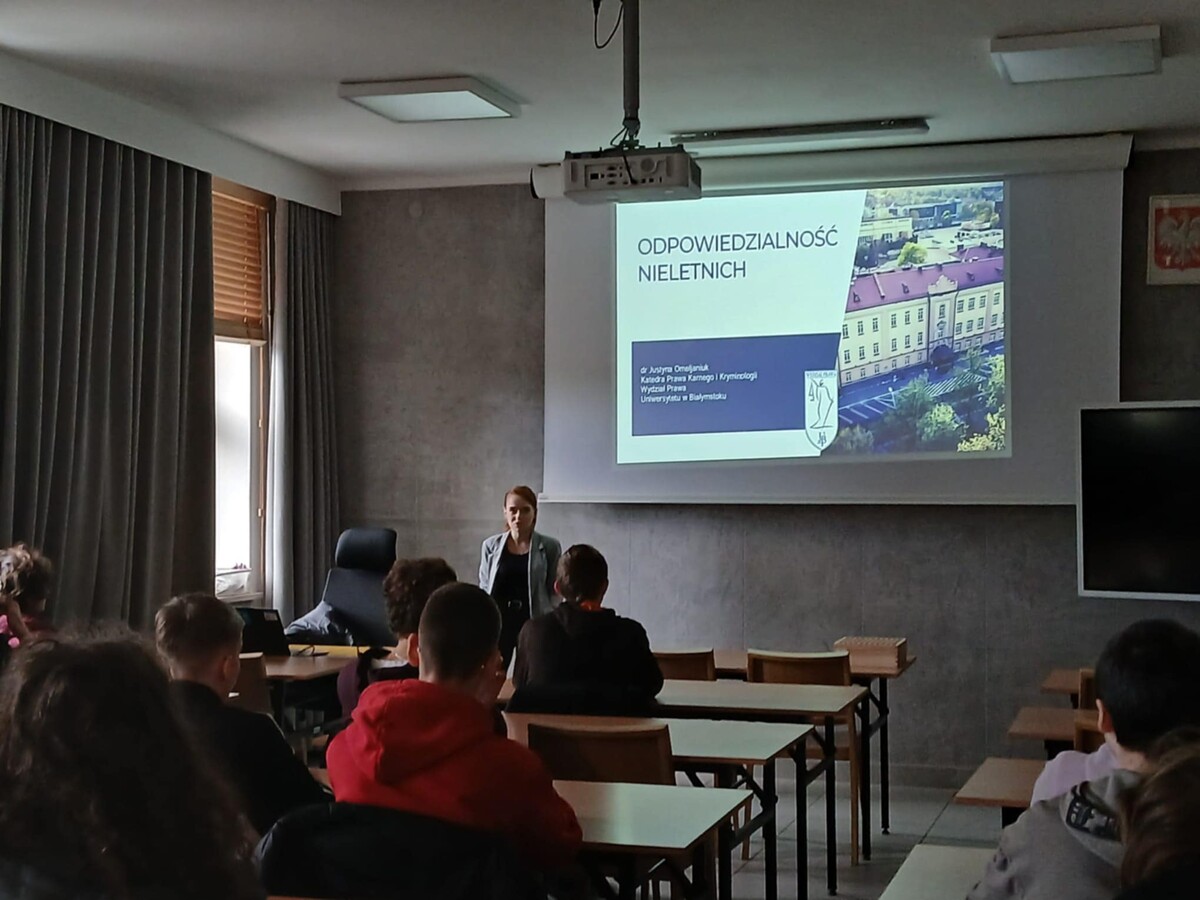 W ramach współpracy z liceami oraz działalności edukacyjnej Katedry Prawa Karnego i Kryminologii, 6 listopada, w Zespole Szkół Technicznych im. gen. W. Andersa w Białymstoku, zajęcia dla uczniów poprowadziła dr Justyna Omeljaniuk.
