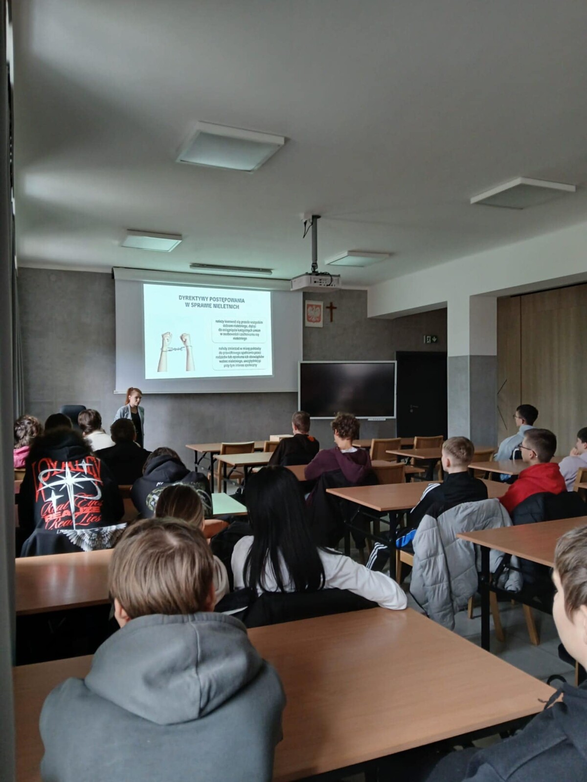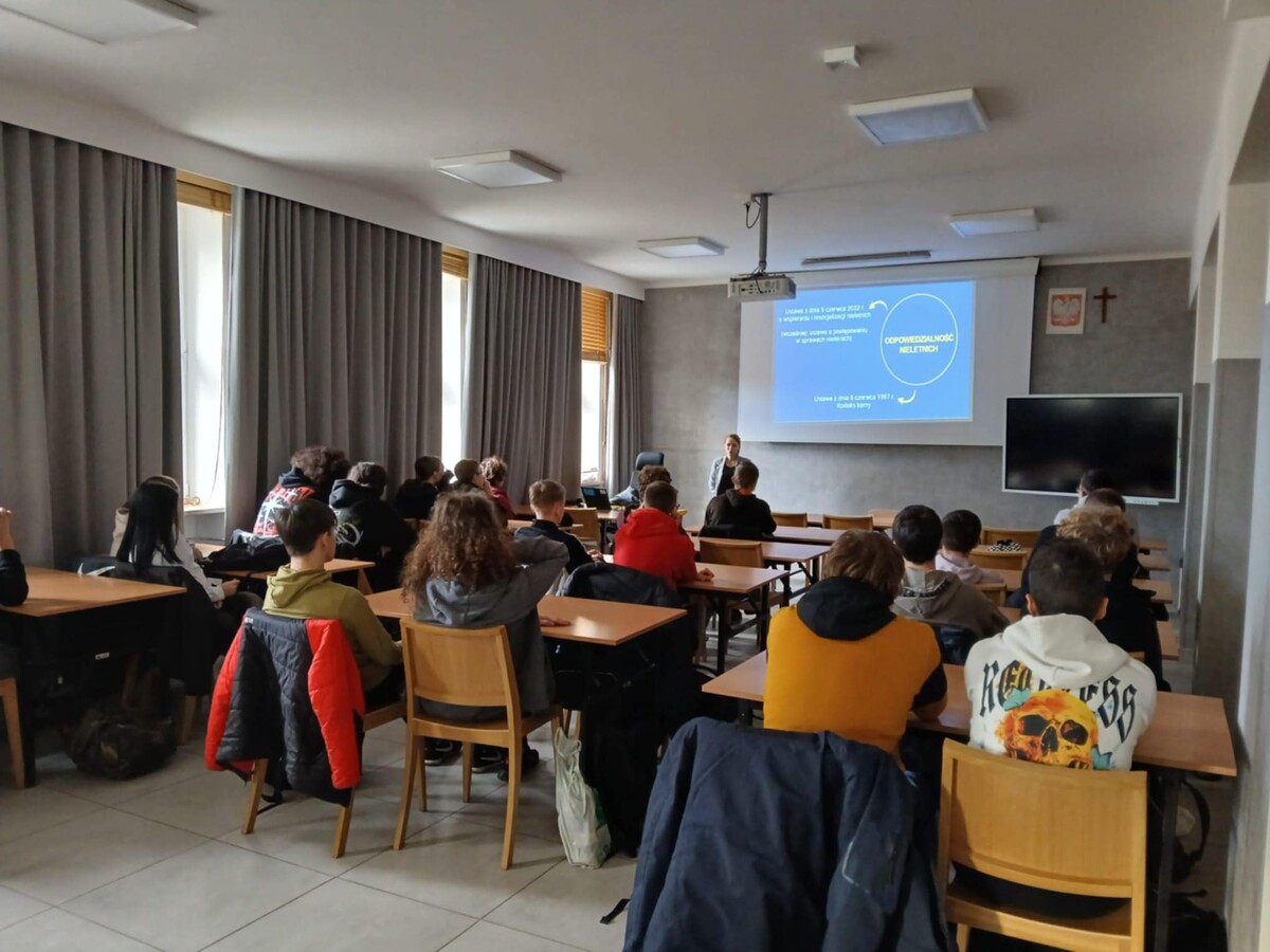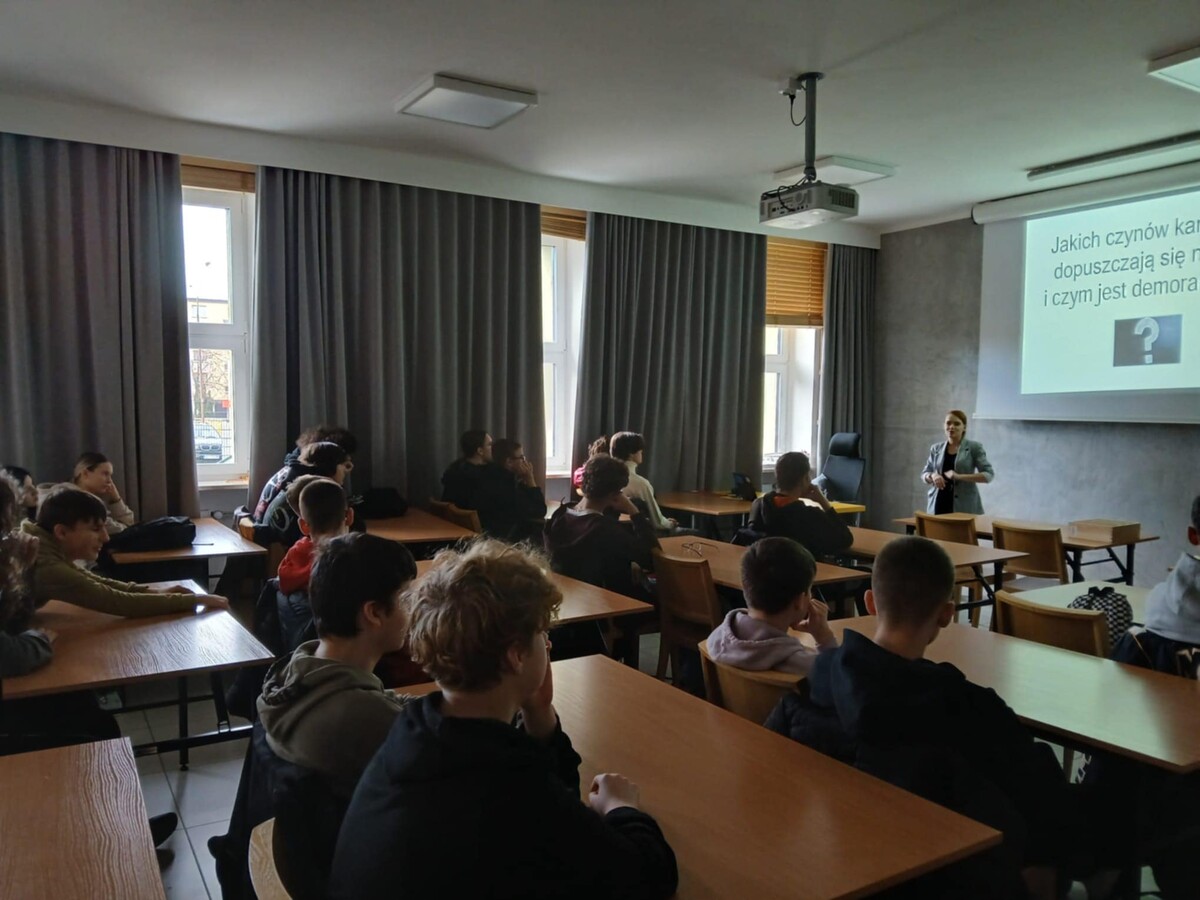 Poruszono też kwestie związane z odpowiedzialnością karną nieletnich. Uczniowie dowiedzieli się, kiedy młodzi ludzie mogą ponosić odpowiedzialność na podstawie Kodeksu karnego.