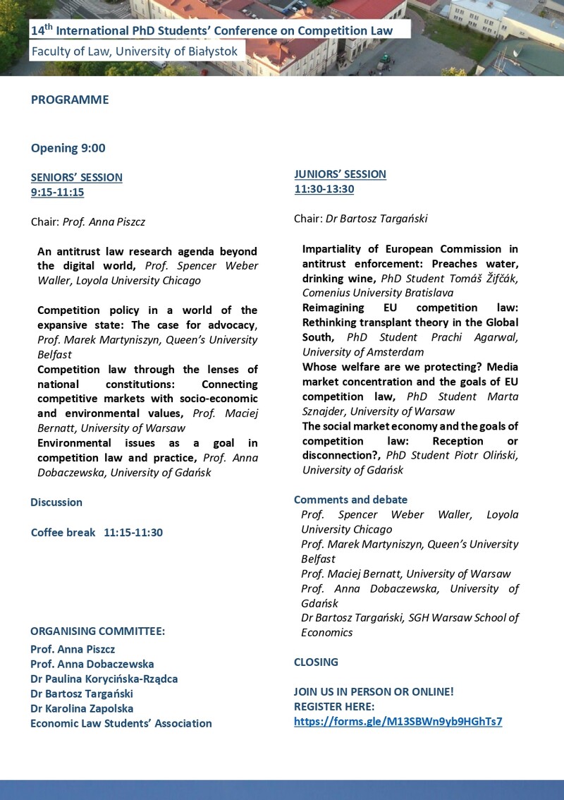 Program wydarzenia obejmuje dwie zasadnicze części, czyli sesję seniorską oraz sesję doktorancką. W sesji seniorskiej wystąpią uznani badacze prawa konkurencji, którzy od lat kształtują debatę naukową w tym obszarze. W roli głównego mówcy konferencji wystąpi prof. Spencer Waller, którego wystąpienie inauguracyjne stanowić będzie punkt odniesienia dla dalszych dyskusji i analiz. Wśród zaproszonych prelegentów - seniorów znaleźli się również prof. Marek Martyniszyn, prof. Anna Dobaczewska, prof. Maciej Bernatt oraz dr Bartosz Targański. Ich wystąpienia poświęcone będą różnorodnym aspektom celów prawa konkurencji, w tym relacji pomiędzy efektywnością ekonomiczną a wartościami społecznymi, a także roli prawa konkurencji we współczesnych systemach prawnych.